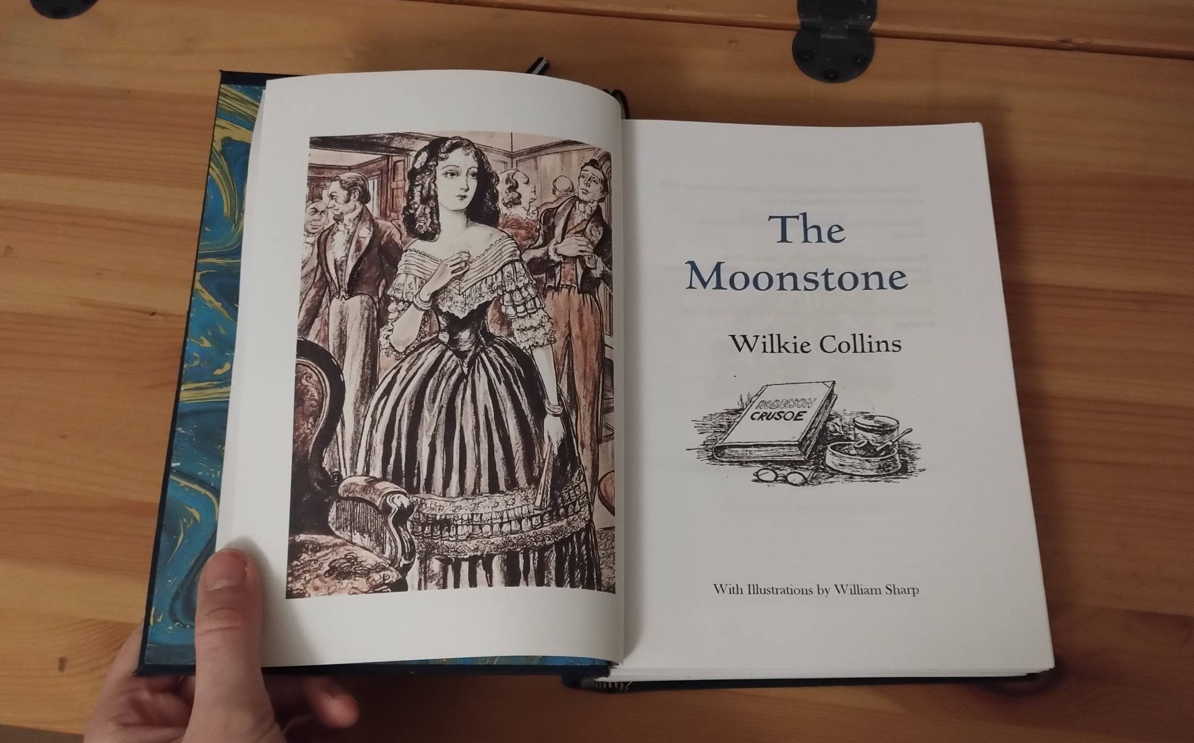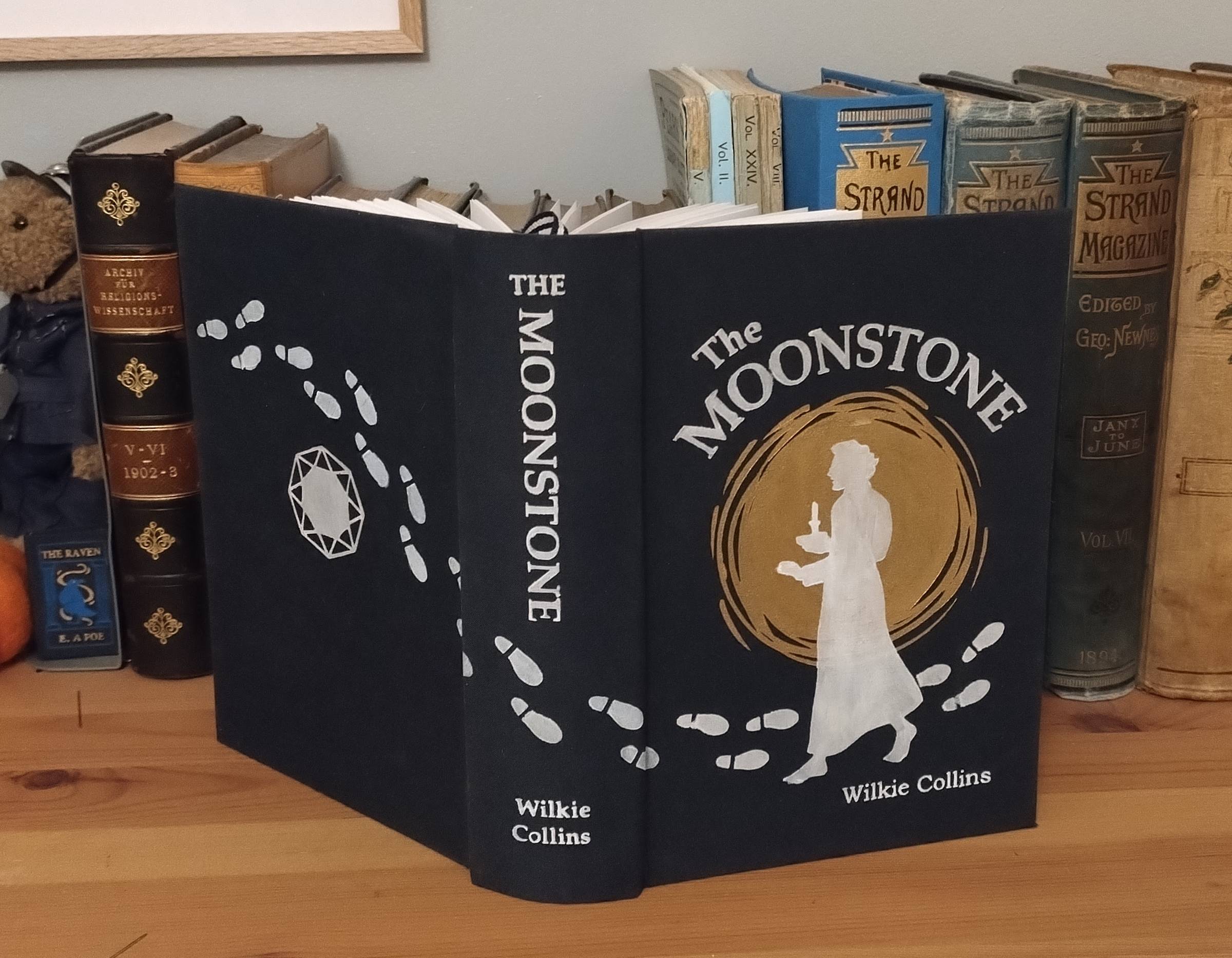I also took some time this month to realise a project that I've had in mind for a long time, which is to make my own binding of Wilkie Collins' The Moonstone. If you're not familiar, The Moonstone written in 1868 is often argued to be the origin of the 'country house' mystery story. I've wanted a nice copy of it for a while, and since I couldn't find one I liked and bookbinding is my big non-computer-based hobby, I... made one! It uses illustrations by WIlliam Sharp from 1946.